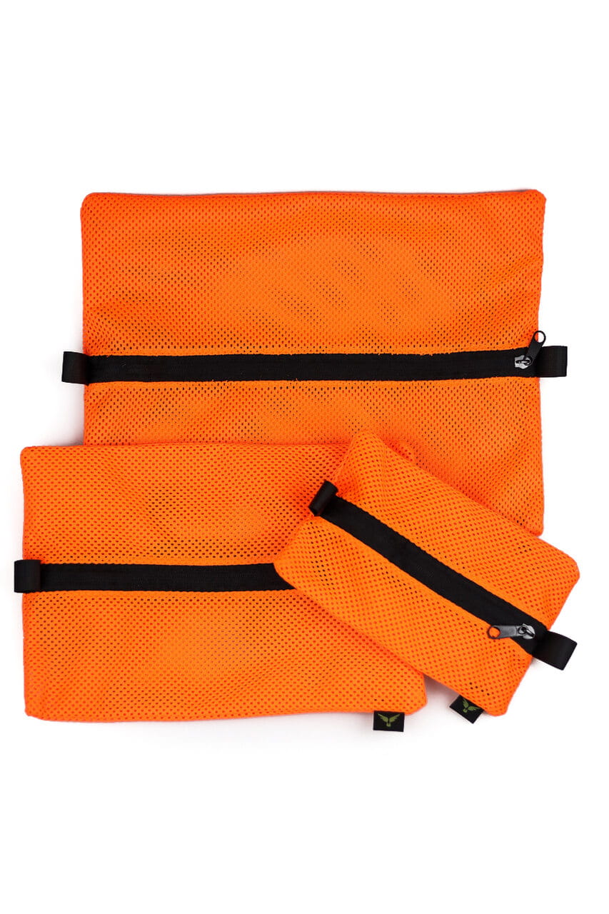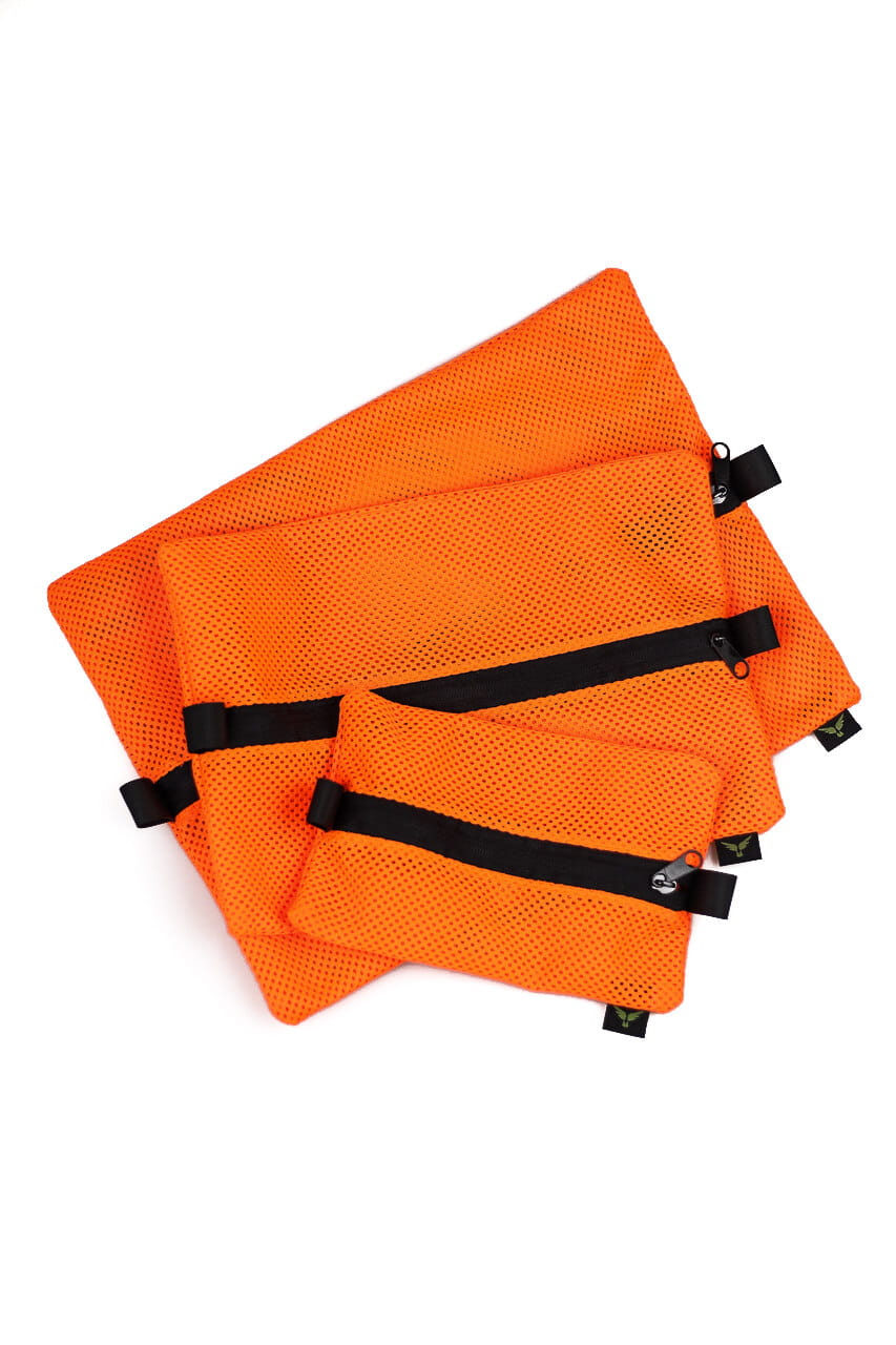 Zestaw trzech wyjątkowo wytrzymałych organizerów wykonanych z siatki konstrukcyjnej.