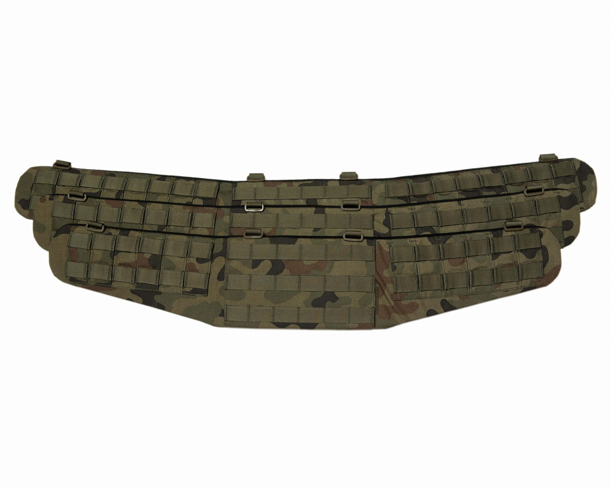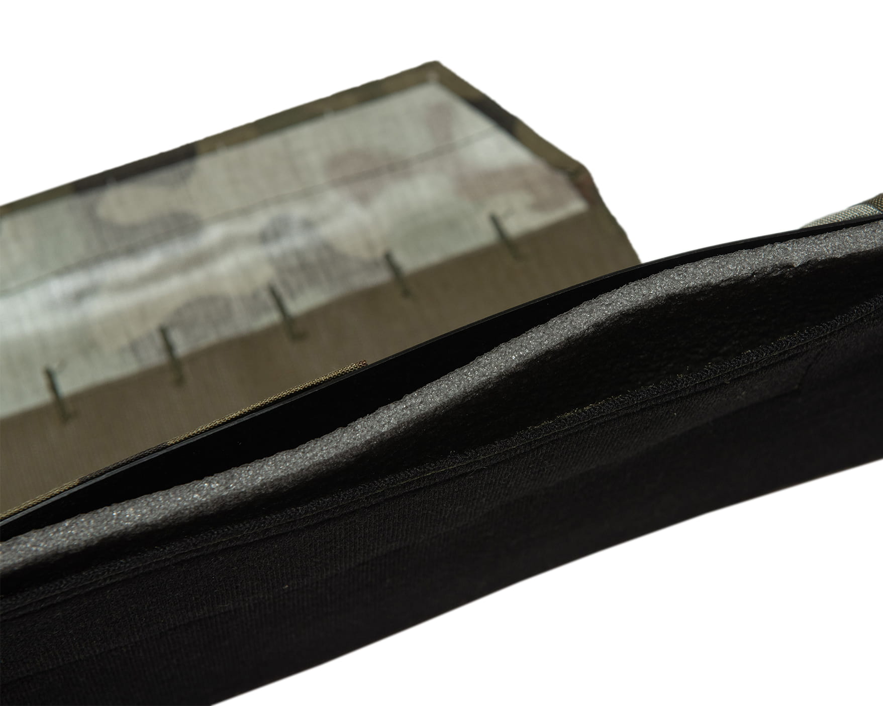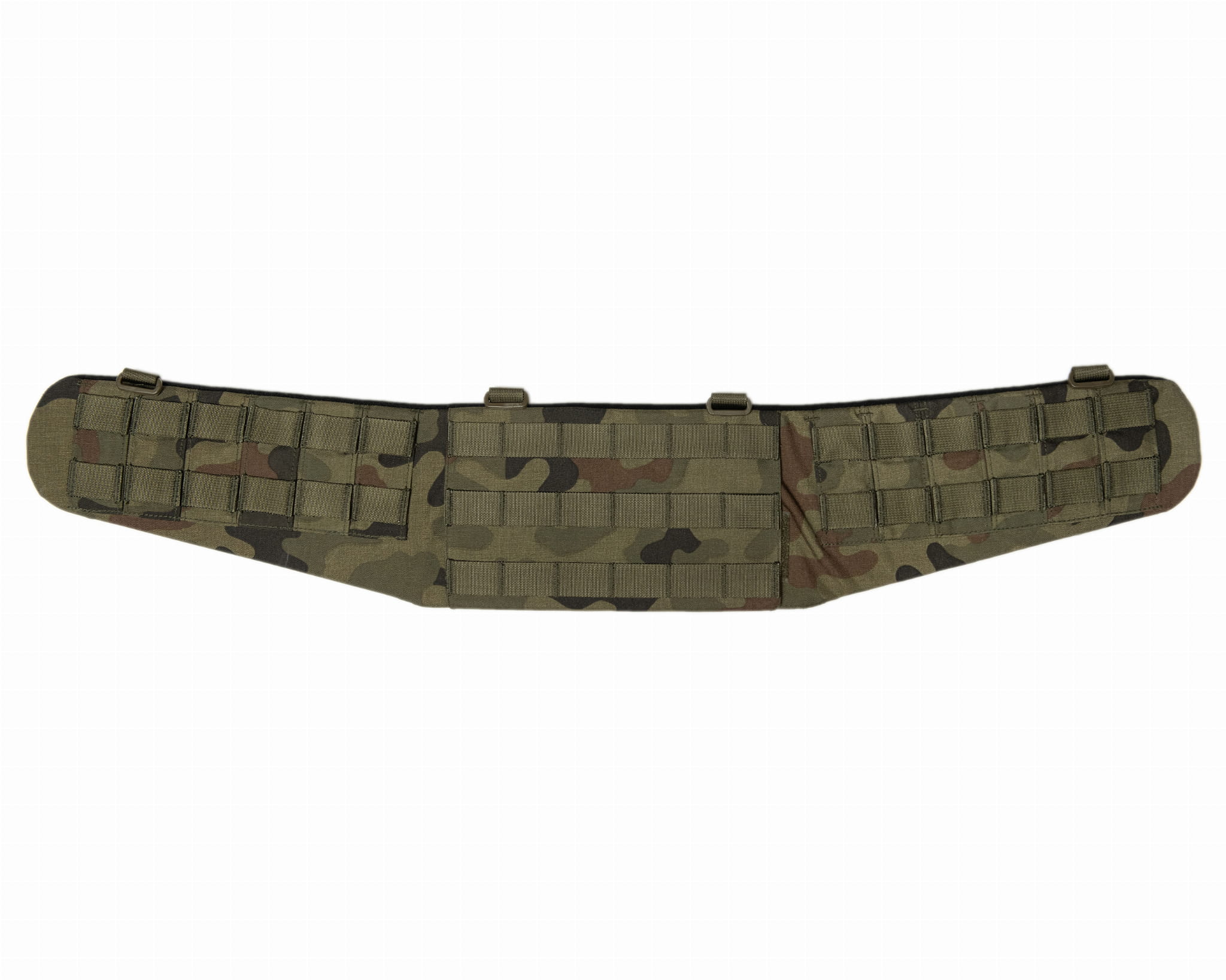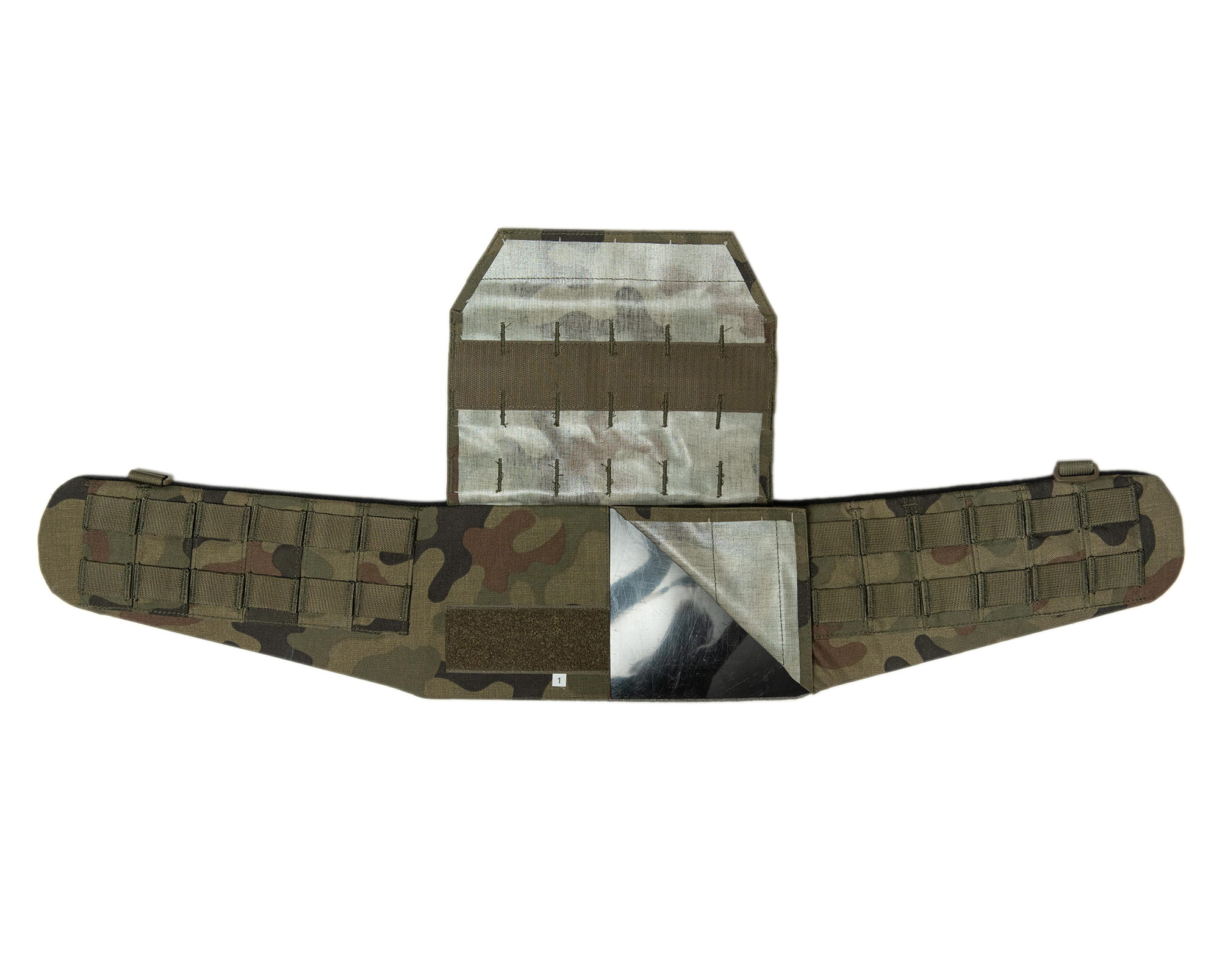 Rękaw z czterema ramkami podtrzymującymi, ukrytymi pod pionowymi podziałkami z komórkami molle. U góry cztery punkty montażu szelek.