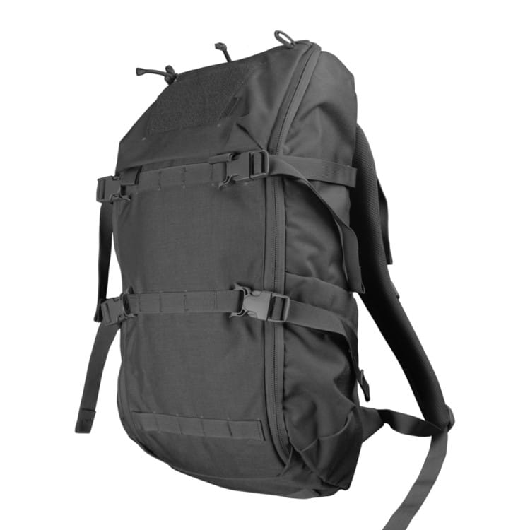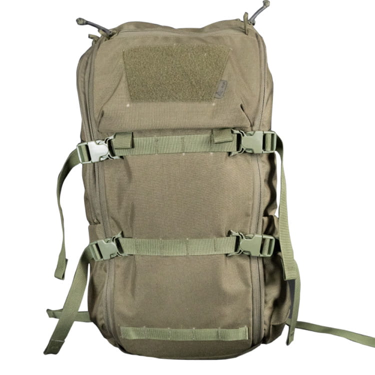 System taśm MOLLE na klapie plecaka oraz pętle na taśmach kompensacyjnych umożliwiają instalowanie dodatkowych kieszeni i sakw plecakowych zwiększających pojemność plecaka.